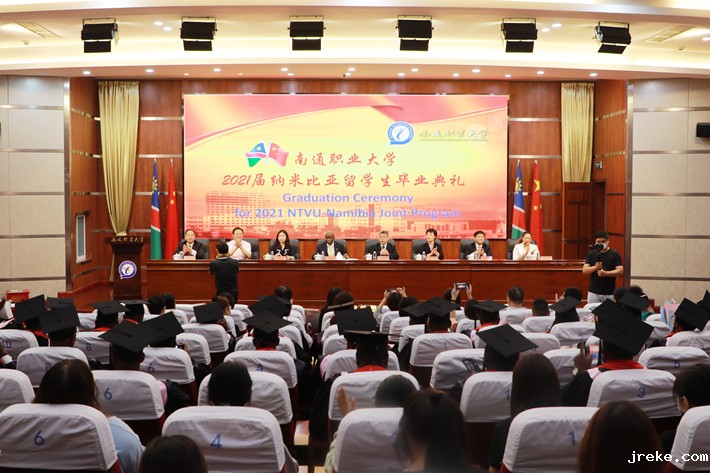6月18日下午,我校在图书馆学术报告厅隆重举行第二届纳米比亚留学生毕业典礼,庆祝纳米比亚“总统振兴计划”项目的39名留学生顺利毕业。纳米比亚驻华大使馆一等秘书尹东格先生、江苏省人民政府外事办公室欧非处处长金尚军、江苏省教育厅国际合作交流处一级主任科员李勤径,南通市人民政府外事办公室主任吴瑕、南通市教育局副局长姜学勤等领导及我校师生来到现场,一起见证这个荣耀时刻,分享开启新征程的喜悦。毕业典礼由副校长戴世明主持。