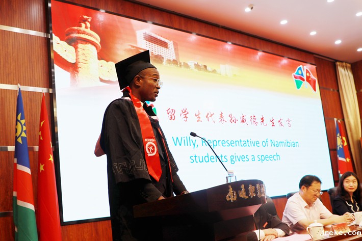 纳米比亚驻华大使馆一等秘书尹东格先生在致辞中感谢了我校领导和老师们的辛勤付出,他希望毕业生们抓住机遇提升自己,好好工作,好好生活。他表示在中国“一带一路”倡议下,纳米比亚2030教育目标一定能够实现。他还勉励留学生们对祖国忠诚,学成回去建设祖国,做中纳友好使者。