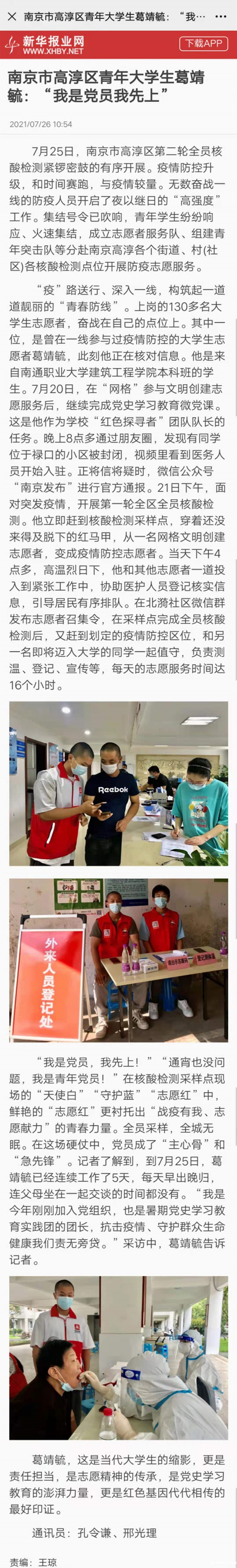 7月26日,新华报业网新闻以“南京市高淳区青年大学生葛靖毓:‘我是党员我先上’ ”为题,报道我校建筑工程学院本科班学生葛靖毓积极主动参与防疫志愿服务,为家乡疫情防控工作贡献力量。以下为报道新闻: