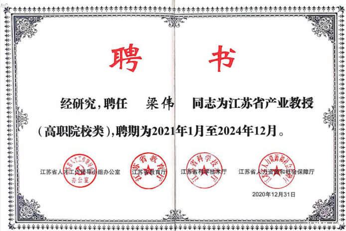 2021年6月25日下午,在学校主楼1306会议室举行了“省级产业教授”聘任仪式,仪式由学校人事处处长孙勤海主持,仪式上褚金星校长向梁博士颁发“江苏省产业教授”聘书并佩戴校徽。南通市委组织部处长王卫华,汽车与交通工程学院领导班子参加了本次聘任仪式。