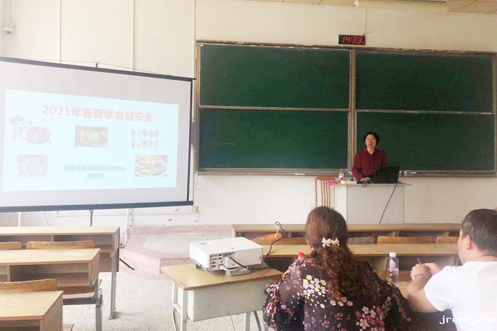 为做好校园春夏季食品安全宣传,增强食堂员工的食品安全意识,进一步提升学校食品安全管理水平,5月27日下午,南通市疾病预防控制中心黄建萍教授应邀来校作题为《2021年春夏季食品安全》的知识讲座。讲座由后勤处处长偶金华主持。全校各食堂负责人及全体工作人员、食品卫生安全管理员等100余人聆听了讲座。
